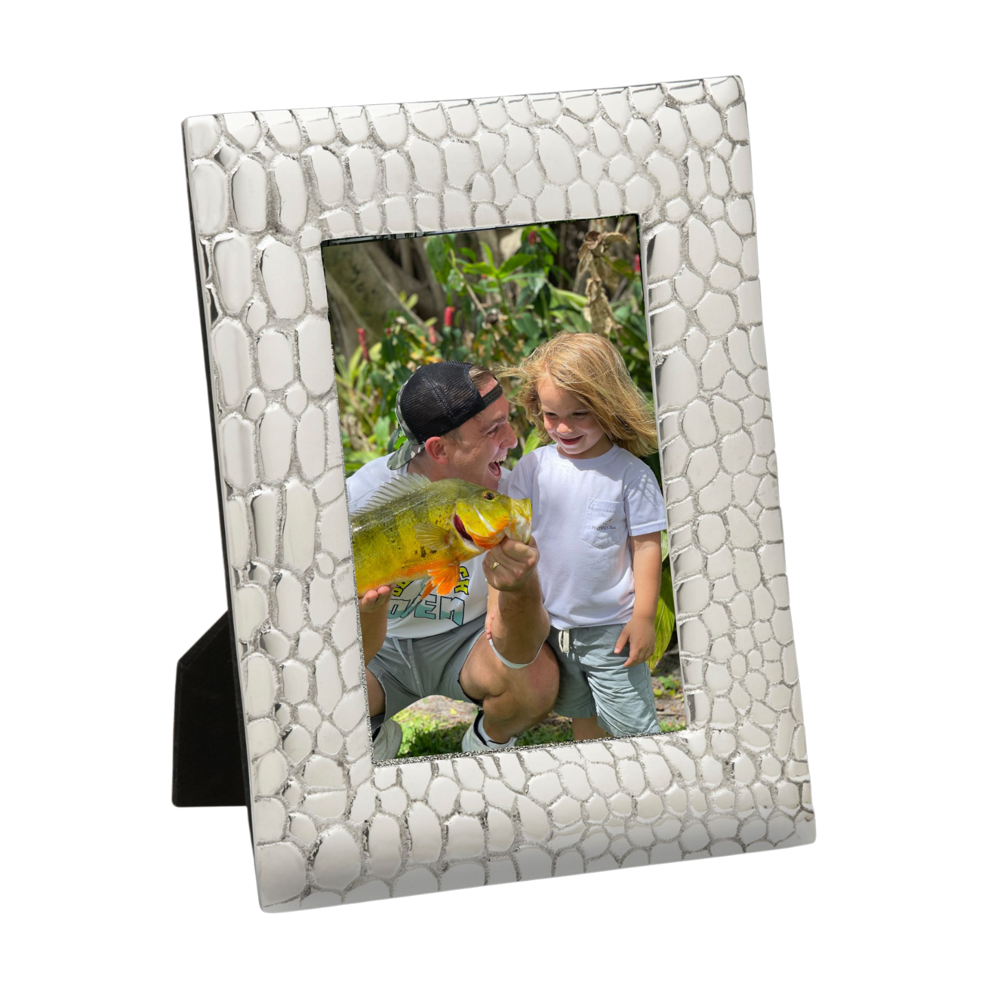 Frame a favorite photo beautifully with our shiny silver Croco design. The Croco Photo Frame holds one 4x6 photo. Handcrafted of food-safe polished aluminum. Size: 9" X 7".